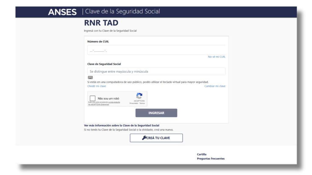 1️⃣ Ingreso al Portal: Entrá al sitio de TAD Reincidencia e iniciá sesión ingresando tu número de CUIL y tu Clave de la Seguridad Social.