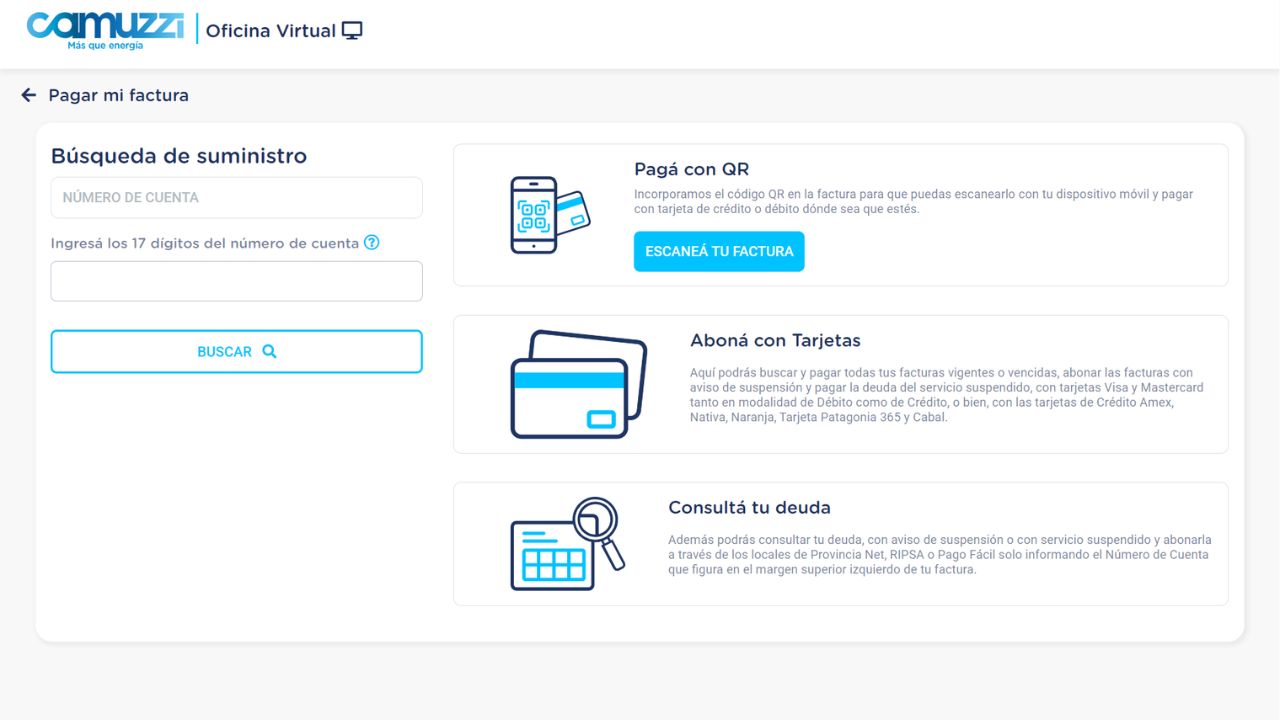 1️⃣ Accedé al Portal Oficial: Ingresá directamente a la sección de Búsqueda de Suministro en la web de Camuzzi. Es un canal de consulta rápida que no requiere registro previo obligatorio para ver deudas.