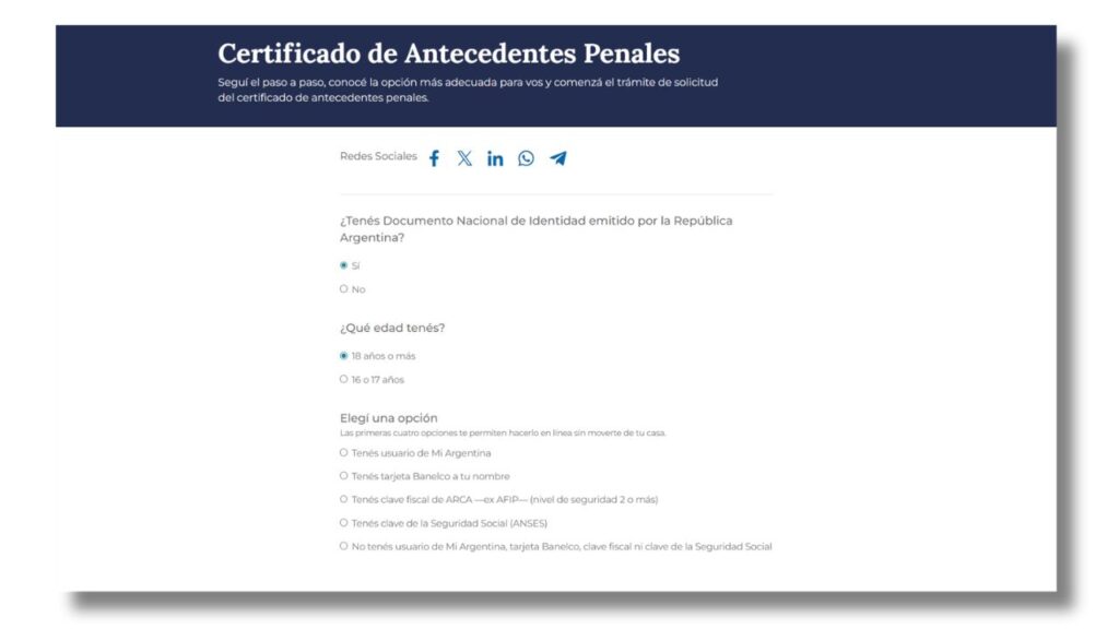 2️⃣ Elección del Canal de Trámite: Hacé clic en la opción “Sacá el certificado de antecedentes penales”. Verás que existen muchas alternativas para hacerlo, incluyendo la modalidad 100% en línea si contás con Clave Fiscal, Mi Argentina o Clave de Seguridad Social.