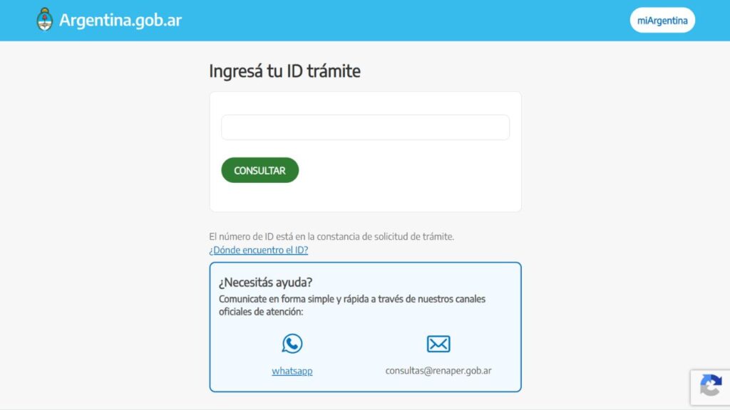 2️⃣ Estado del Trámite: Si tenés el ID de la constancia que te entregaron el día que hiciste el trámite presencial, podés ingresar a Mi Trámite – RENAPER para ver en qué etapa de envío se encuentra.